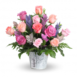 Arrangement of 12 roses in pastel tones accompanied by seasonal foliage, made in a metal planter carved with floral motifs. Includes a dedication printed on fine stationery.