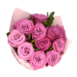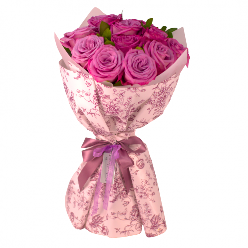 Bouquet of roses in different colors. Wrapped in waterproof florist paper. Includes a dedication printed on fine stationery.