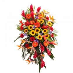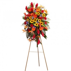 A stunning tropical flower arrangement designed on a tripod, made with birds of paradise, gerberas, sunflowers, ginger, and seasonal foliage. Its vibrant color combination conveys energy, distinction, and elegance, ideal for institutional ceremonies, openings, or corporate events. Includes a dedication printed on fine stationery.