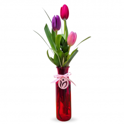 A 3-tulip arrangement in a red glass vase, accompanied by seasonal foliage. Includes a printed message on fine stationery.