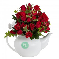 Hermosas mini rosas presentado en tetera de cerámica decorativa, acompañadas con follaje de estación. Incluye una dedicatoria impresa en fina papelería.