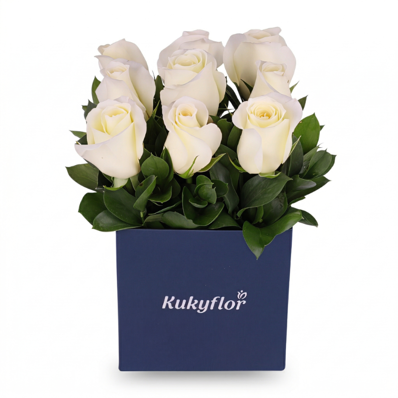 Rosas blancas acompañado de follaje de estación, elaborado en box resistente al agua, con base plástica protectora al interior. Incluye una dedicatoria impresa en fina papelería.
