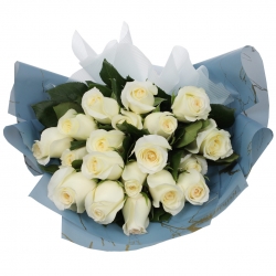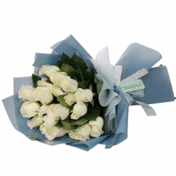 Ramo de 18 rosas envuelto en papel de floristería resistente al agua. Incluye una dedicatoria impresa en fina papelería.
