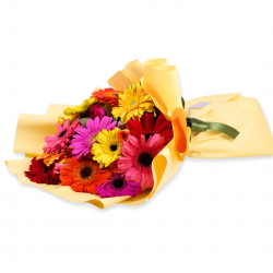 Majestuosas gerberas y mini rosas de nuestros cultivos, envueltas en finos papeles de floristería, acompañado de follaje de estación. Incluye una dedicatoria impresa.