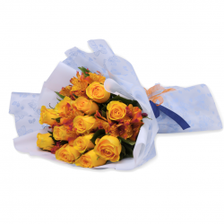 Ramo de rosas amarillas y astromelias, envuelto en papel de floristería resistente al agua. Incluye una dedicatoria impresa en fina papelería.