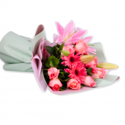 Elegante combinación de rosas, gerberas y lilium en ramo, envuelto en finos papeles de floristería. Incluye una dedicatoria impresa en fina papelería.