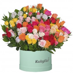 Hermosas mini rosas en tonos pasteles, acompañadas de follaje de estación, elaborada en box soft touch resistente al agua con base plástica protectora al interior. Incluye una dedicatoria impresa en fina papelería.